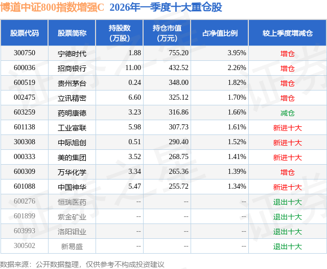 从基金规模来看,博道中证800指数增强C基金2026年一季度公布的基金规模为1.32亿元。该基金最新一期资产配置为:股票占净值比93.17%,债券占净值比5.14%,现金占净值比1.52%。从基金持仓来看,该基金当季前十大股票仓位达18.66%,第一大重仓股为宁德时代(300750),持仓占比为3.95%。