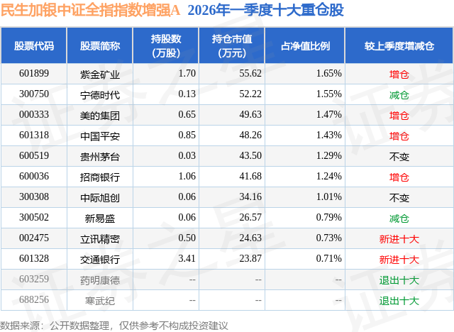 从基金规模来看,民生加银中证全指指数增强A基金2026年一季度公布的基金规模为0.07亿元。该基金最新一期资产配置为:股票占净值比94.01%,无债券类资产,现金占净值比7.18%。从基金持仓来看,该基金当季前十大股票仓位达11.87%,第一大重仓股为紫金矿业(601899),持仓占比为1.65%。