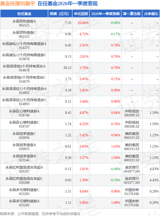 从基金规模来看,永赢多元增利债券C基金2026年一季度公布的基金规模为1.51亿元。该基金最新一期资产配置为:股票占净值比4.29%,债券占净值比85.35%,现金占净值比1.73%。从基金持仓来看,该基金当季前十大股票仓位达2.1%,第一大重仓股为中国宏桥(01378),持仓占比为0.29%。