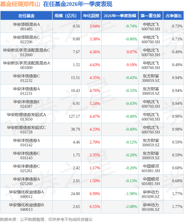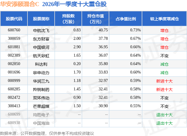 证券之星消息,日前华安添颐混合C基金公布一季报,2026年一季度最新规模0.0亿元,季度净值涨幅为-0.8%。