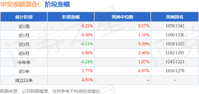 从业绩表现来看,华安添颐混合C基金过去一年净值涨幅为3.77%,在同类基金中排名1016/1270,同类基金过去一年净值涨幅中位数为6.97%。而基金过去一年的最大回撤为-1.64%,成立以来的最大回撤为-1.64%。