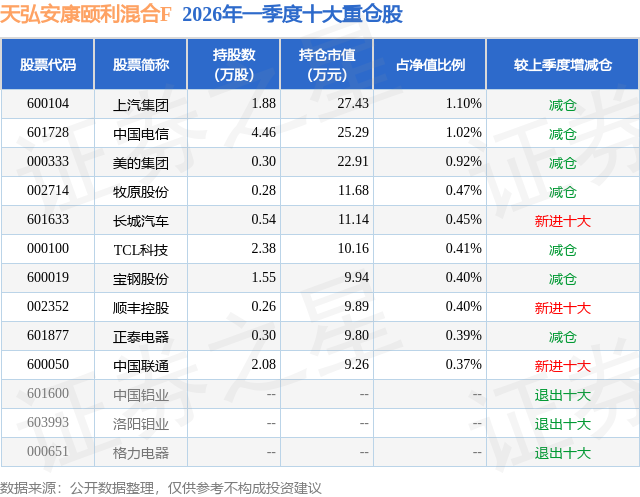 从基金规模来看,天弘安康颐利混合F基金2026年一季度公布的基金规模为0.0亿元,较上一期规模1.01万元变化了-0.66万元,环比变化了-65.2%。该基金最新一期资产配置为:股票占净值比10.06%,债券占净值比87.37%,现金占净值比2.31%。从基金持仓来看,该基金当季前十大股票仓位达5.93%,第一大重仓股为上汽集团(600104),持仓占比为1.1%。