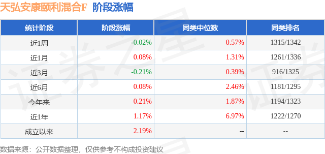 从业绩表现来看,天弘安康颐利混合F基金过去一年净值涨幅为1.17%,在同类基金中排名1222/1270,同类基金过去一年净值涨幅中位数为6.97%。而基金过去一年的最大回撤为-1.09%,成立以来的最大回撤为-1.09%。