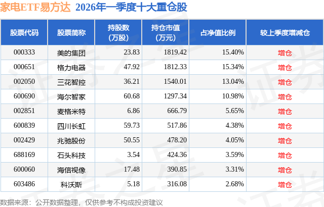 从基金规模来看,家电ETF易方达基金2026年一季度公布的基金规模为1.18亿元,较上一期规模1.22亿元变化了-374.98万元,环比变化了-3.08%。该基金最新一期资产配置为:股票占净值比99.6%,无债券类资产,现金占净值比0.44%。从基金持仓来看,该基金当季前十大股票仓位达78.42%,第一大重仓股为美的集团(000333),持仓占比为15.4%。