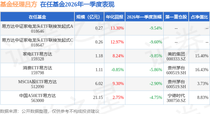 证券之星消息,日前家电ETF易方达基金公布一季报,2026年一季度最新规模1.18亿元,季度净值涨幅为-9.85%。