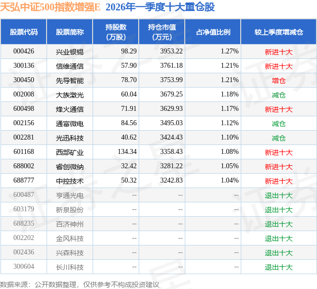 从基金规模来看,天弘中证500指数增强E基金2026年一季度公布的基金规模为0.05亿元,较上一期规模1.73万元变化了502.74万元,环比变化了29055.37%。该基金最新一期资产配置为:股票占净值比94.59%,债券占净值比0.17%,现金占净值比5.41%。从基金持仓来看,该基金当季前十大股票仓位达11.43%,第一大重仓股为兴业银锡(000426),持仓占比为1.27%。