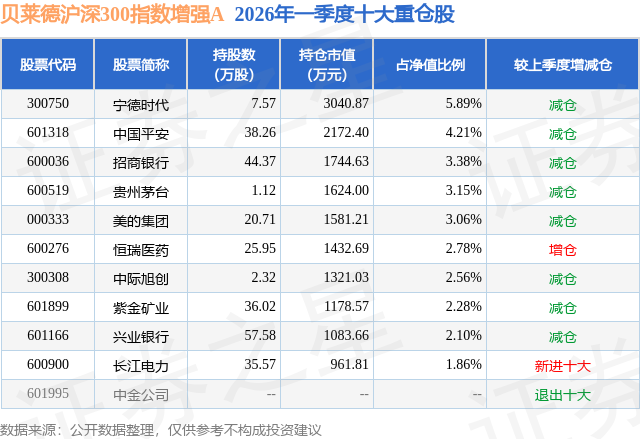 从基金规模来看,贝莱德沪深300指数增强A基金2026年一季度公布的基金规模为2.55亿元。该基金最新一期资产配置为:股票占净值比94.86%,债券占净值比3.12%,现金占净值比10.65%。从基金持仓来看,该基金当季前十大股票仓位达31.27%,第一大重仓股为宁德时代(300750),持仓占比为5.89%。