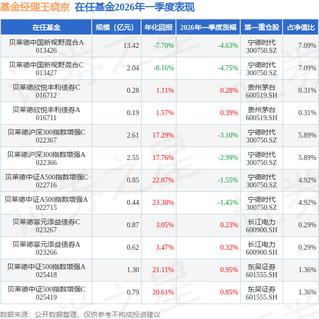 贝莱德沪深300指数增强A现任基金经理为王晓京,本季度增聘基金经理王晓京。其中在任基金经理王晓京已从业1年又148天,2024年11月26日正式接手管理贝莱德沪深300指数增强A,任职期间累计回报为25.78%。目前还管理着12只基金产品(包括A类和C类),其中本季度表现最佳的基金为贝莱德中证500指数增强A(025418),季度净值涨幅为0.95%。