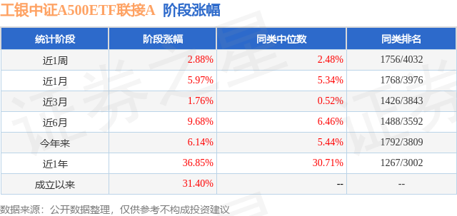 从业绩表现来看,工银中证A500ETF联接A基金过去一年净值涨幅为36.85%,在同类基金中排名1267/3002,同类基金过去一年净值涨幅中位数为30.71%。而基金过去一年的最大回撤为-8.17%,成立以来的最大回撤为-11.36%。