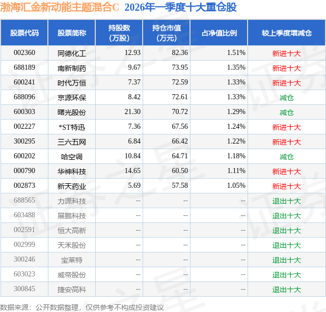 从基金规模来看,渤海汇金新动能主题混合C基金2026年一季度公布的基金规模为0.14亿元,较上一期规模291.0万元变化了1076.57万元,环比变化了369.96%。该基金最新一期资产配置为:股票占净值比94.0%,无债券类资产,现金占净值比6.67%。从基金持仓来看,该基金当季前十大股票仓位达12.61%,第一大重仓股为同德化工(002360),持仓占比为1.51%。