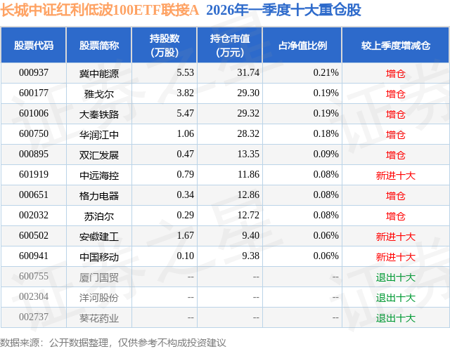 从基金规模来看,长城中证红利低波100ETF联接A基金2026年一季度公布的基金规模为0.89亿元,较上一期规模8858.5万元变化了63.12万元,环比变化了0.71%。该基金最新一期资产配置为:股票占净值比4.23%,债券占净值比0.59%,现金占净值比5.01%。从基金持仓来看,该基金当季前十大股票仓位达1.22%,第一大重仓股为冀中能源(000937),持仓占比为0.21%。