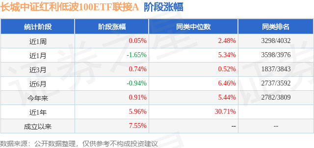 从业绩表现来看,长城中证红利低波100ETF联接A基金过去一年净值涨幅为5.96%,在同类基金中排名,同类基金过去一年净值涨幅中位数为30.71%。而基金过去一年的最大回撤为-6.0%,成立以来的最大回撤为-6.0%。