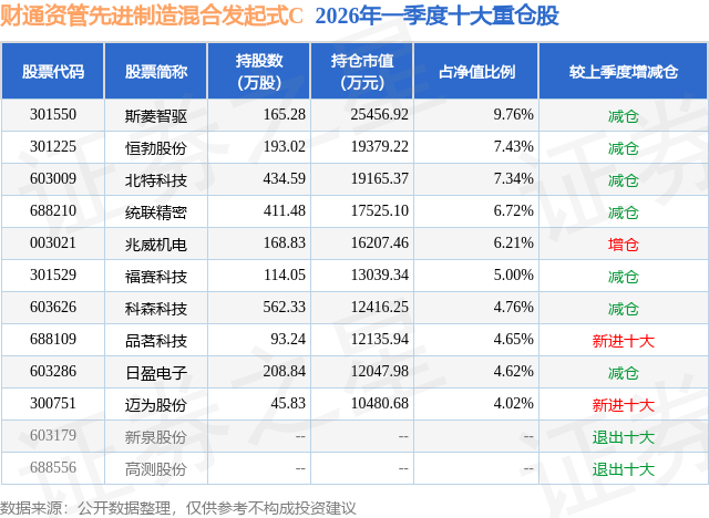 从基金规模来看,财通资管先进制造混合发起式C基金2026年一季度公布的基金规模为23.85亿元,较上一期规模331.87万元变化了23.81亿元,环比变化了71754.09%。该基金最新一期资产配置为:股票占净值比86.9%,债券占净值比1.35%,现金占净值比23.09%。从基金持仓来看,该基金当季前十大股票仓位达60.51%,第一大重仓股为斯菱智驱(301550),持仓占比为9.76%。