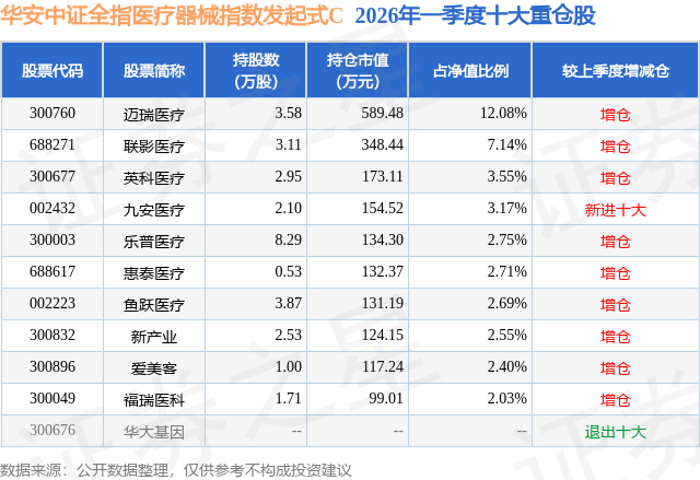 从基金规模来看,华安中证全指医疗器械指数发起式C基金2026年一季度公布的基金规模为0.25亿元。该基金最新一期资产配置为:股票占净值比93.47%,无债券类资产,现金占净值比7.05%。从基金持仓来看,该基金当季前十大股票仓位达41.07%,第一大重仓股为迈瑞医疗(300760),持仓占比为12.08%。