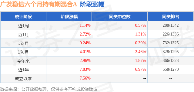 从业绩表现来看,广发稳信六个月持有期混合A基金过去一年净值涨幅为7.83%,在同类基金中排名558/1270,同类基金过去一年净值涨幅中位数为6.97%。而基金过去一年的最大回撤为-3.26%,成立以来的最大回撤为-3.26%。