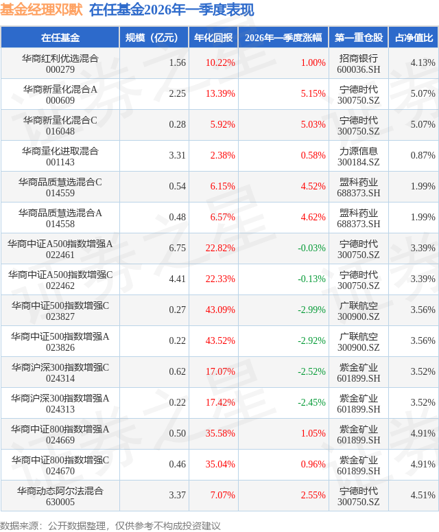 证券之星消息,日前华商中证A500指数增强C基金公布一季报,2026年一季度最新规模4.41亿元,季度净值涨幅为-0.13%。
