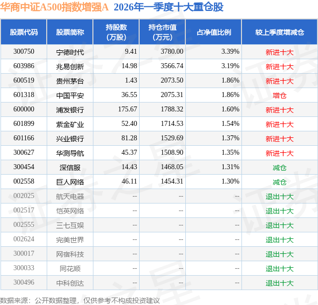 从基金规模来看,华商中证A500指数增强A基金2026年一季度公布的基金规模为6.75亿元,较上一期规模13.51亿元变化了-6.75亿元,环比变化了-50.01%。该基金最新一期资产配置为:股票占净值比92.58%,无债券类资产,现金占净值比7.45%。从基金持仓来看,该基金当季前十大股票仓位达18.77%,第一大重仓股为宁德时代(300750),持仓占比为3.39%。