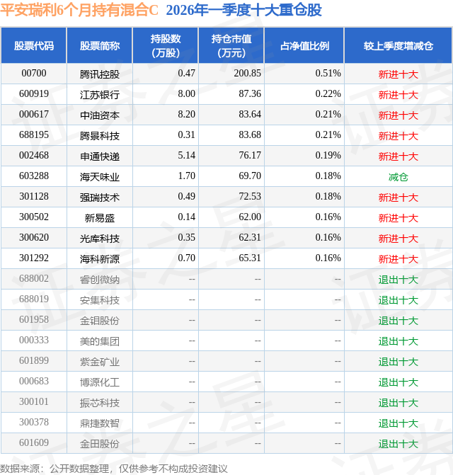 从基金规模来看,平安瑞利6个月持有混合C基金2026年一季度公布的基金规模为0.98亿元。该基金最新一期资产配置为:股票占净值比4.6%,债券占净值比121.23%,现金占净值比4.35%。从基金持仓来看,该基金当季前十大股票仓位达2.18%,第一大重仓股为腾讯控股(00700),持仓占比为0.51%。
