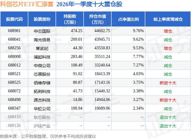 从基金规模来看,科创芯片ETF汇添富基金2026年一季度公布的基金规模为45.7亿元,较上一期规模53.0亿元变化了-7.3亿元,环比变化了-13.77%。该基金最新一期资产配置为:股票占净值比99.55%,无债券类资产,现金占净值比0.53%。从基金持仓来看,该基金当季前十大股票仓位达60.72%,第一大重仓股为中芯国际(688981),持仓占比为9.76%。