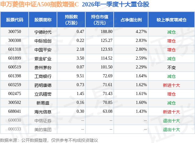 从基金规模来看,申万菱信中证A500指数增强C基金2026年一季度公布的基金规模为0.27亿元。该基金最新一期资产配置为:股票占净值比92.58%,无债券类资产,现金占净值比7.65%。从基金持仓来看,该基金当季前十大股票仓位达22.68%,第一大重仓股为宁德时代(300750),持仓占比为4.27%。