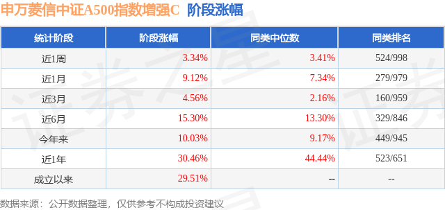 从业绩表现来看,申万菱信中证A500指数增强C基金过去一年净值涨幅为30.46%,在同类基金中排名523/651,同类基金过去一年净值涨幅中位数为44.44%。而基金过去一年的最大回撤为-7.89%,成立以来的最大回撤为-8.43%。