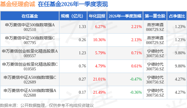 证券之星消息,日前申万菱信中证A500指数增强C基金公布一季报,2026年一季度最新规模0.27亿元,季度净值涨幅为-0.47%。