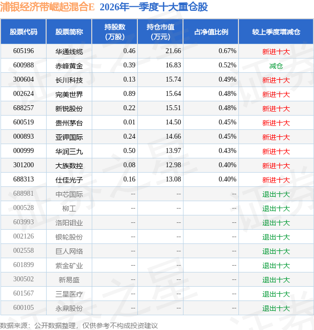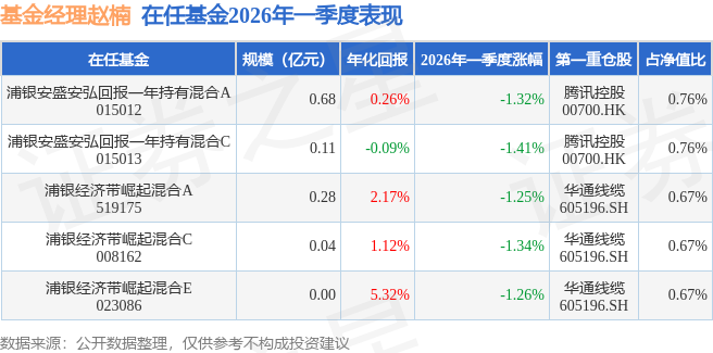 从基金规模来看,浦银经济带崛起混合E基金2026年一季度公布的基金规模为0.0亿元,较上一期规模0.03万元变化了-0.01万元,环比变化了-18.79%。该基金最新一期资产配置为:股票占净值比21.81%,债券占净值比42.55%,现金占净值比1.73%。从基金持仓来看,该基金当季前十大股票仓位达4.77%,第一大重仓股为华通线缆(605196),持仓占比为0.67%。