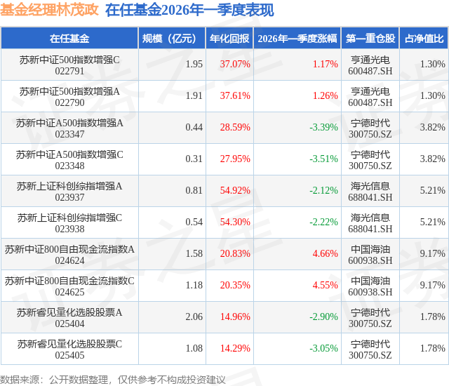 证券之星消息,日前苏新中证500指数增强A基金公布一季报,2026年一季度最新规模1.91亿元,季度净值涨幅为1.26%。