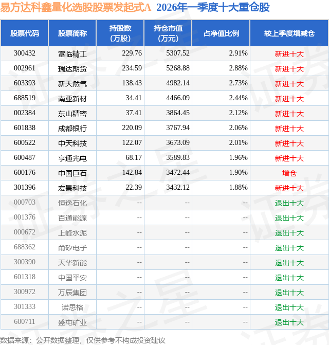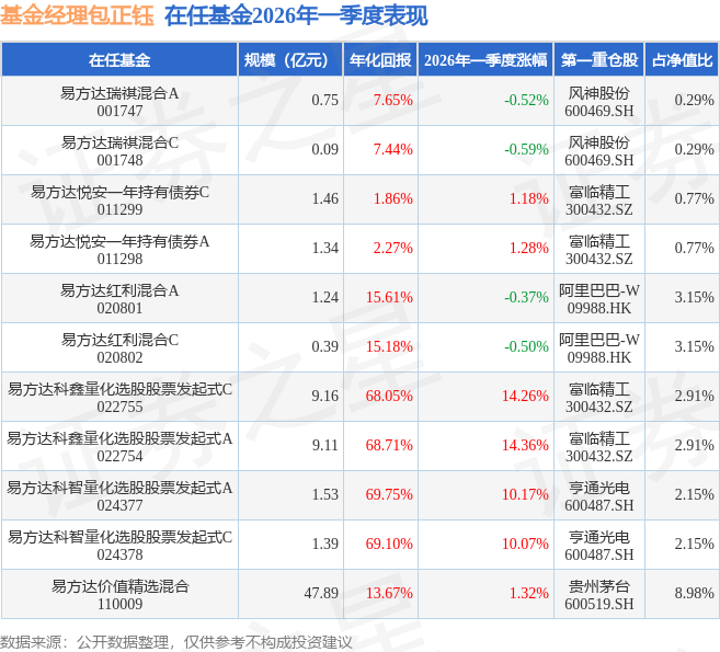 从基金规模来看,易方达科鑫量化选股股票发起式A基金2026年一季度公布的基金规模为9.11亿元。该基金最新一期资产配置为:股票占净值比91.74%,无债券类资产,现金占净值比11.92%。从基金持仓来看,该基金当季前十大股票仓位达22.89%,第一大重仓股为富临精工(300432),持仓占比为2.91%。