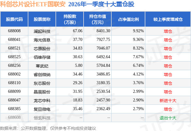 证券之星消息,日前科创芯片设计ETF国联安基金公布一季报,2026年一季度最新规模8.47亿元,季度净值涨幅为0.88%。