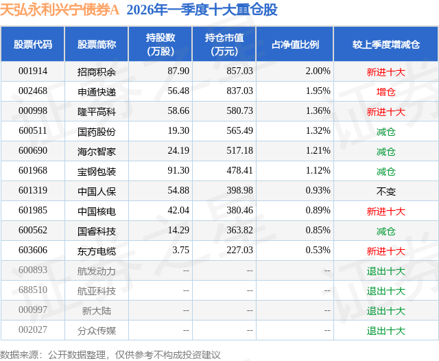 从基金规模来看,天弘永利兴宁债券A基金2026年一季度公布的基金规模为0.73亿元。该基金最新一期资产配置为:股票占净值比13.19%,债券占净值比104.68%,现金占净值比2.54%。从基金持仓来看,该基金当季前十大股票仓位达12.16%,第一大重仓股为招商积余(001914),持仓占比为2.0%。