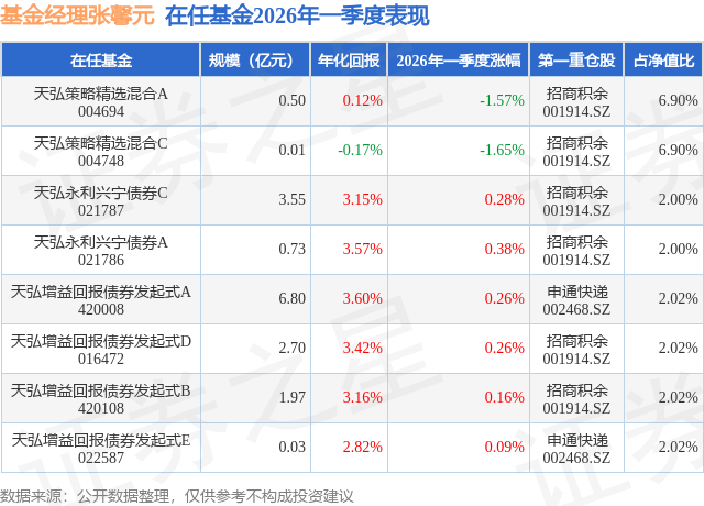 证券之星消息,日前天弘永利兴宁债券A基金公布一季报,2026年一季度最新规模0.73亿元,季度净值涨幅为0.38%。