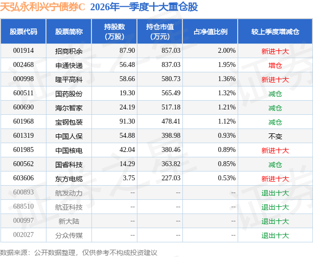 从基金规模来看,天弘永利兴宁债券C基金2026年一季度公布的基金规模为3.55亿元。该基金最新一期资产配置为:股票占净值比13.19%,债券占净值比104.68%,现金占净值比2.54%。从基金持仓来看,该基金当季前十大股票仓位达12.16%,第一大重仓股为招商积余(001914),持仓占比为2.0%。