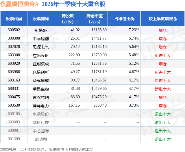从基金规模来看,永赢睿恒混合A基金2026年一季度公布的基金规模为7.61亿元。该基金最新一期资产配置为:股票占净值比86.17%,无债券类资产,现金占净值比14.32%。从基金持仓来看,该基金当季前十大股票仓位达50.12%,第一大重仓股为新易盛(300502),持仓占比为7.23%。