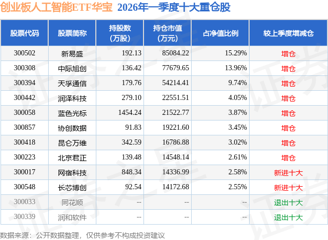 从基金规模来看,创业板人工智能ETF华宝基金2026年一季度公布的基金规模为55.64亿元,较上一期规模38.08亿元变化了17.56亿元,环比变化了46.1%。该基金最新一期资产配置为:股票占净值比99.47%,无债券类资产,现金占净值比0.82%。从基金持仓来看,该基金当季前十大股票仓位达61.12%,第一大重仓股为新易盛(300502),持仓占比为15.29%。