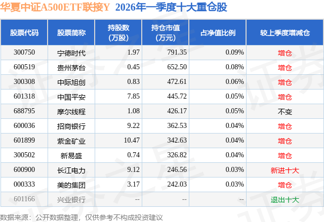 从基金规模来看,华夏中证A500ETF联接Y基金2026年一季度公布的基金规模为3.0亿元,较上一期规模3689.5万元变化了2.63亿元,环比变化了711.86%。该基金最新一期资产配置为:股票占净值比2.73%,无债券类资产,现金占净值比6.21%。从基金持仓来看,该基金当季前十大股票仓位达0.51%,第一大重仓股为宁德时代(300750),持仓占比为0.09%。