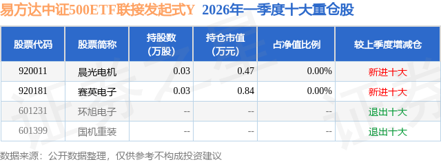 从基金规模来看,易方达中证500ETF联接发起式Y基金2026年一季度公布的基金规模为1.44亿元,较上一期规模244.72万元变化了1.41亿元,环比变化了5775.35%。该基金最新一期资产配置为:无股票类资产,债券占净值比1.66%,现金占净值比4.37%。从基金持仓来看,该基金当季前十大股票仓位达0.0%,第一大重仓股为晨光电机(920011),持仓占比为0.0%。