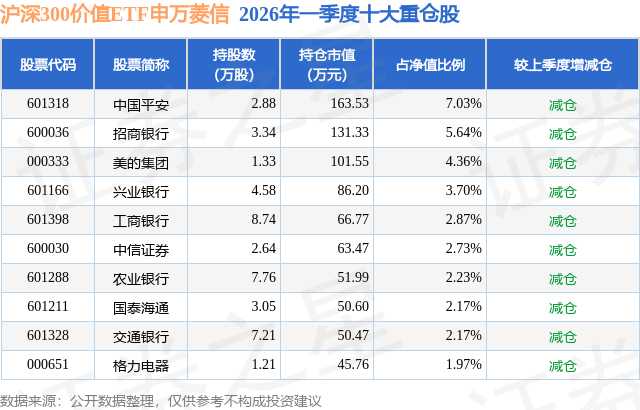 从基金规模来看,沪深300价值ETF申万菱信基金2026年一季度公布的基金规模为0.23亿元,较上一期规模2676.36万元变化了-349.04万元,环比变化了-13.04%。该基金最新一期资产配置为:股票占净值比98.19%,无债券类资产,现金占净值比2.26%。从基金持仓来看,该基金当季前十大股票仓位达34.87%,第一大重仓股为中国平安(601318),持仓占比为7.03%。