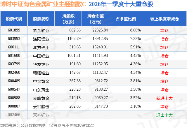 从基金规模来看,博时中证有色金属矿业主题指数C基金2026年一季度公布的基金规模为17.51亿元,较上一期规模1457.49万元变化了17.36亿元,环比变化了11912.79%。该基金最新一期资产配置为:股票占净值比93.17%,无债券类资产,现金占净值比6.61%。从基金持仓来看,该基金当季前十大股票仓位达49.08%,第一大重仓股为紫金矿业(601899),持仓占比为8.66%。