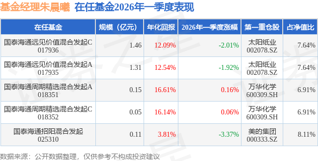 国泰海通周期精选混合发起A现任基金经理为朱晨曦,本季度增聘基金经理朱晨曦,近期离任的基金经理为冯自力。其中在任基金经理朱晨曦已从业3年又54天,2025年11月13日正式接手管理国泰海通周期精选混合发起A,任职期间累计回报为11.98%。目前还管理着5只基金产品(包括A类和C类),其中本季度表现最佳的基金为国泰海通周期精选混合发起A(018351),季度净值涨幅为0.16%。