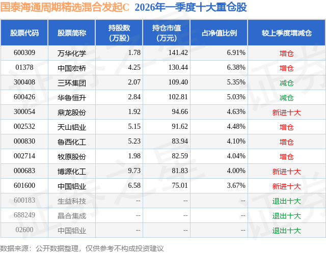 从基金规模来看,国泰海通周期精选混合发起C基金2026年一季度公布的基金规模为0.05亿元,较上一期规模244.52万元变化了272.04万元,环比变化了111.25%。该基金最新一期资产配置为:股票占净值比90.66%,无债券类资产,现金占净值比9.8%。从基金持仓来看,该基金当季前十大股票仓位达48.59%,第一大重仓股为万华化学(600309),持仓占比为6.91%。