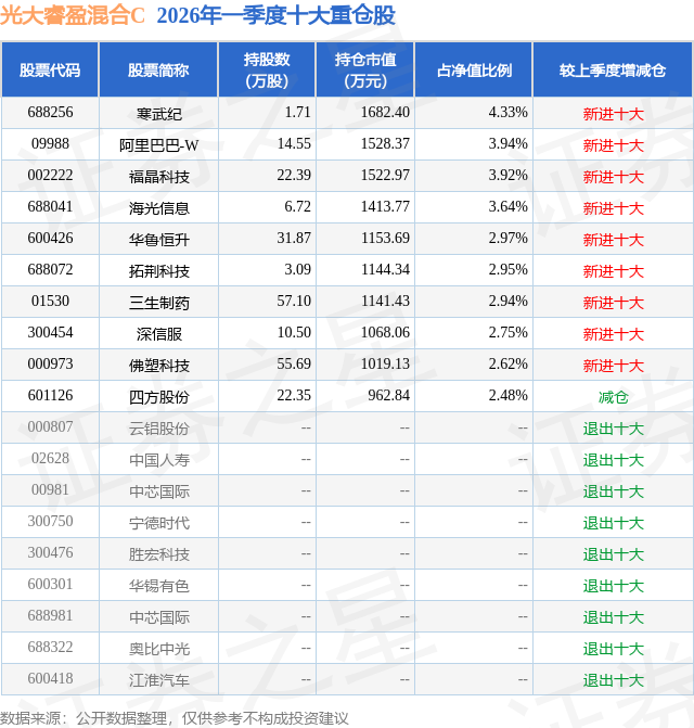 从基金规模来看,光大睿盈混合C基金2026年一季度公布的基金规模为0.0亿元,较上一期规模9.66万元变化了-0.35万元,环比变化了-3.58%。该基金最新一期资产配置为:股票占净值比81.39%,债券占净值比7.25%,现金占净值比12.7%。从基金持仓来看,该基金当季前十大股票仓位达32.54%,第一大重仓股为寒武纪(688256),持仓占比为4.33%。