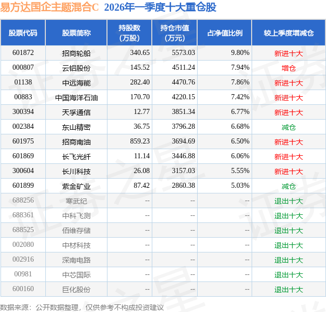 从基金规模来看,易方达国企主题混合C基金2026年一季度公布的基金规模为1.52亿元,较上一期规模3.74亿元变化了-2.22亿元,环比变化了-59.42%。该基金最新一期资产配置为:股票占净值比91.19%,无债券类资产,现金占净值比10.87%。从基金持仓来看,该基金当季前十大股票仓位达69.61%,第一大重仓股为招商轮船(601872),持仓占比为9.8%。