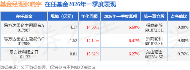 证券之星消息,日前易方达国企主题混合C基金公布一季报,2026年一季度最新规模1.52亿元,季度净值涨幅为6.47%。
