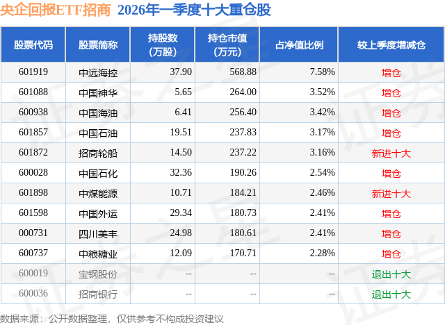 从基金规模来看,央企回报ETF招商基金2026年一季度公布的基金规模为0.75亿元,较上一期规模6772.37万元变化了729.72万元,环比变化了10.77%。该基金最新一期资产配置为:股票占净值比99.32%,无债券类资产,现金占净值比0.69%。从基金持仓来看,该基金当季前十大股票仓位达32.95%,第一大重仓股为中远海控(601919),持仓占比为7.58%。