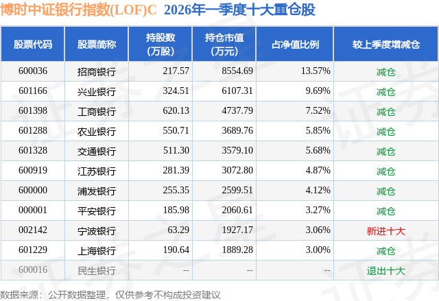 证券之星消息,日前博时中证银行指数(LOF)C基金公布一季报,2026年一季度最新规模0.63亿元,季度净值涨幅为-2.65%。