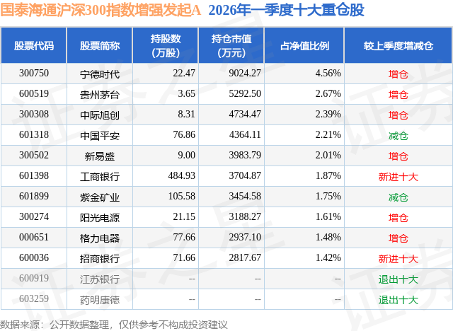 从基金规模来看,国泰海通沪深300指数增强发起A基金2026年一季度公布的基金规模为11.93亿元,较上一期规模6.97亿元变化了4.95亿元,环比变化了70.99%。该基金最新一期资产配置为:股票占净值比91.27%,无债券类资产,现金占净值比8.73%。从基金持仓来看,该基金当季前十大股票仓位达21.97%,第一大重仓股为宁德时代(300750),持仓占比为4.56%。