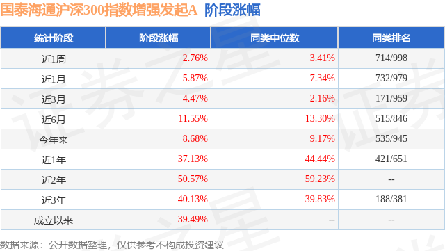 从业绩表现来看,国泰海通沪深300指数增强发起A基金过去一年净值涨幅为37.13%,在同类基金中排名421/651,同类基金过去一年净值涨幅中位数为44.44%。而基金过去一年的最大回撤为-6.17%,成立以来的最大回撤为-19.62%。
