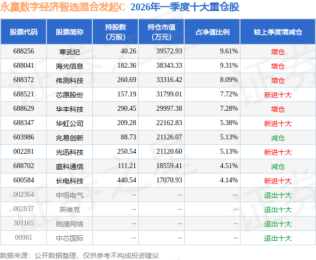 从基金规模来看,永赢数字经济智选混合发起C基金2026年一季度公布的基金规模为33.71亿元,较上一期规模5606.39万元变化了33.15亿元,环比变化了5913.3%。该基金最新一期资产配置为:股票占净值比89.67%,无债券类资产,现金占净值比6.65%。从基金持仓来看,该基金当季前十大股票仓位达66.3%,第一大重仓股为寒武纪(688256),持仓占比为9.61%。