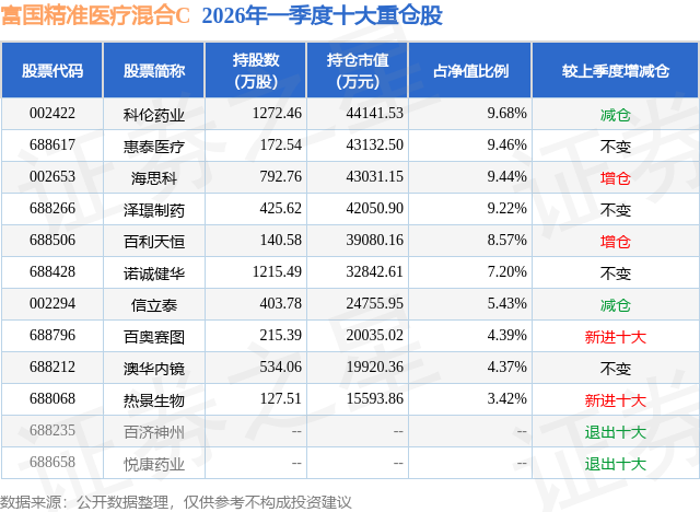 从基金规模来看,富国精准医疗混合C基金2026年一季度公布的基金规模为13.74亿元,较上一期规模6.53亿元变化了7.21亿元,环比变化了110.27%。该基金最新一期资产配置为:股票占净值比93.29%,无债券类资产,现金占净值比5.93%。从基金持仓来看,该基金当季前十大股票仓位达71.18%,第一大重仓股为科伦药业(002422),持仓占比为9.68%。